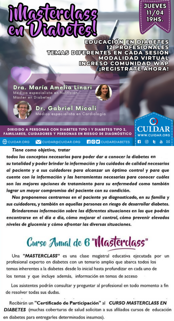 MASTERCLASS EN DIABETES 360º - Curso Anual para Personas con Diabetes Tipo1, Tipo 2, Familiares, Cuidadores. Edición 2024.Abril